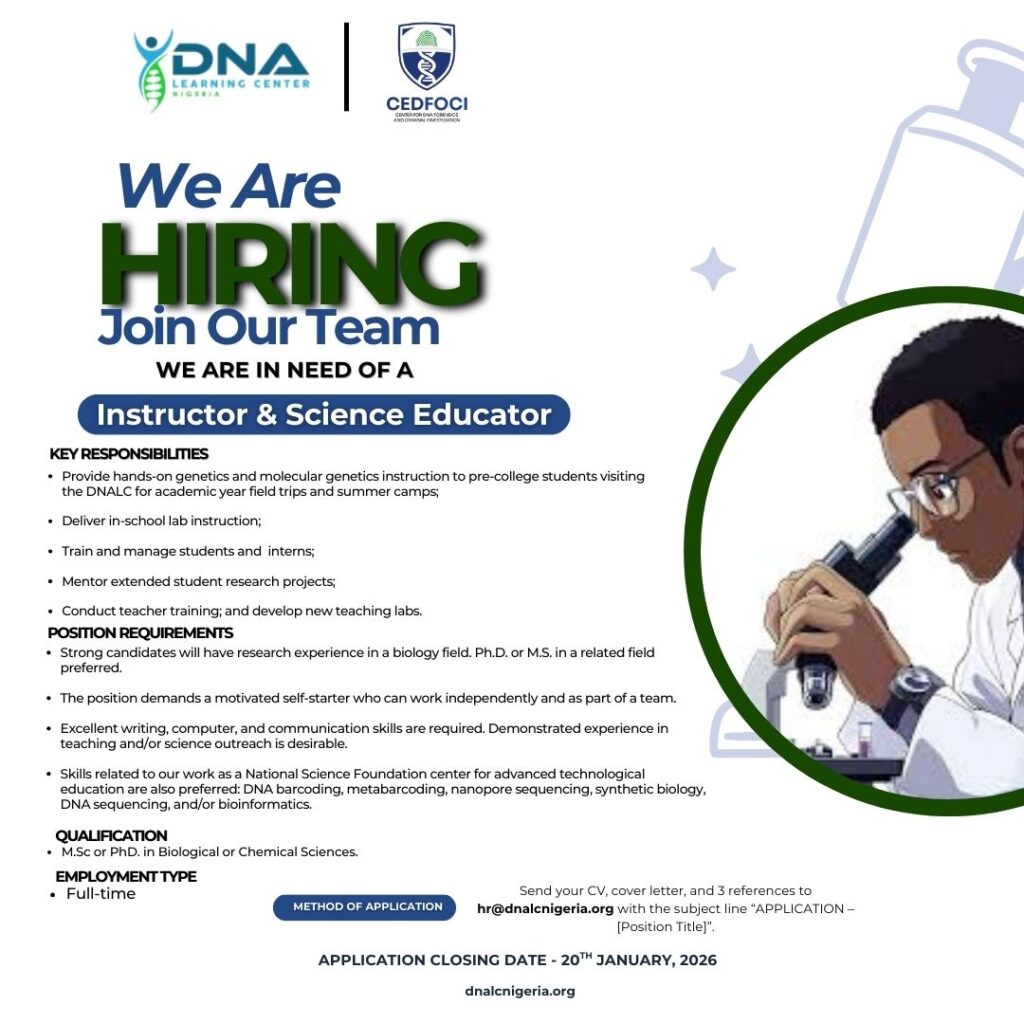 DNA Learning Centre Nigeria is seeking a passionate and skilled Instructor and Science Educator to join our team. Position: Instructor & Science EducatorEmployment Type: Full-TimeExperience Required: 3–5 YearsQualification: M.Sc or PhD. in Biological or Chemical Sciences.Location: Nigeria Key Responsibilities: Provide hands-on genetics and molecular genetics instruction to pre-college students visiting the DNALC for academic year […]
