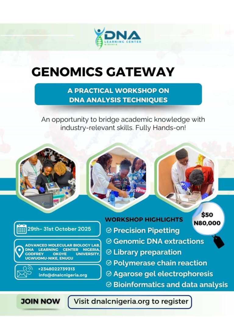 Welcome to the Workshops page of the DNA Learning Center Nigeria (DNALC Nigeria). Our workshops are designed to provide hands-on training and practical skills in various areas of molecular biology, genetics, and forensic science. We aim to foster an engaging learning environment that empowers participants to apply their knowledge in real-world scenarios.